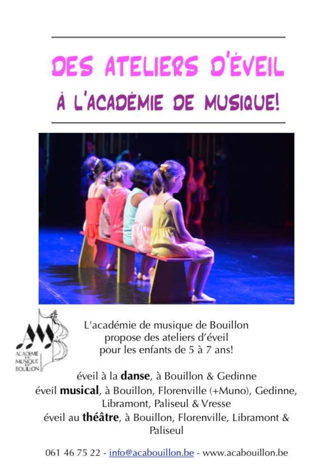 Dès 5 ans, les petiots ont accès aux ateliers d'éveil à la musique (toutes les implantations), d'éveil au théâtre (Bouillon, Florenville, Gedinne, Libramont, Paliseul) et d'éveil à la danse (Bouillon, Gedinne).